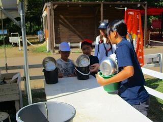 緑のバケツは羊,黒のバケツは馬の餌が入っています。牧草は,お鍋のような入れ物に入れて与えます。