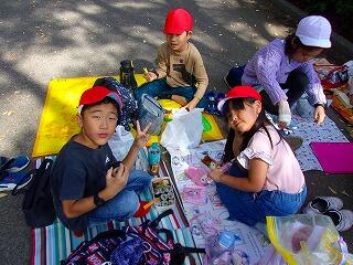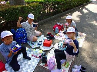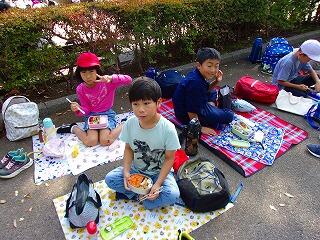 ショーが終わるとお弁当の時間です。座ってお弁当をいただきました。みんな笑顔でおいしそうでした。