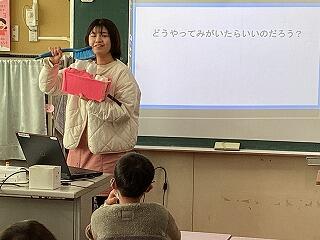 作り終わると説明の練習です。教卓でスライドを操作しながら,説明しています。担任に聞いてもらいアドバイスを受けます。