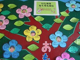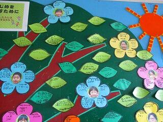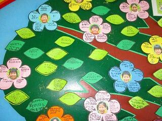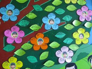 8月下旬から12月生まれの友達を紹介しています。花びらには,名前やできるようになったこと,好きなことなどの自己紹介が書いてあります。異学年の友達のことを知ることができます。