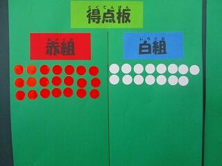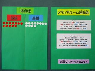 1つめの種目名は,「赤組?白組?いえるかな?」です。ルールは,本を借りるときに,図書館指導員の先生に赤組か白組か伝えてチームの色シールがもらい得点板に貼ります。