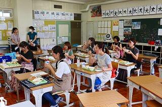 保護者のみなさんにも子供たちと同じように給食の配膳を体験していただきました。