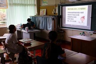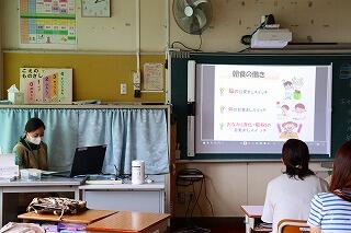 最後に1年生担任から,普段の給食の様子や学級での給食指導の内容についてお伝えしました。