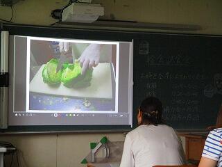 給食試食の後は,給食センターの栄養士さんから学校給食の目標や献立作成の留意点,給食調理の様子などを説明していただきました。給食調理の様子は,普段見ることのできない給食センターの様子を写真で見せていただきました。