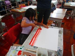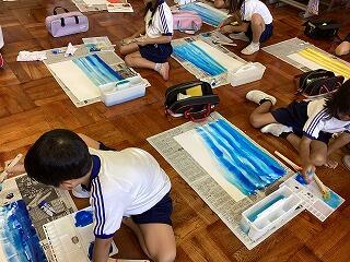 大きな画用紙に刷毛でゆっくりと色を染め,どの子もきれいなグラデージョンを仕上げていきました。