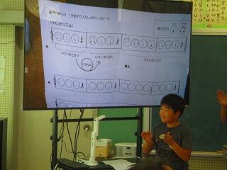 ワークシートをモニタに映して発表しました。聞いている人は,手拍子とリズムが合っているかを確認しながら聞きました。聴いたリズムをみんなでたたいてみました。
