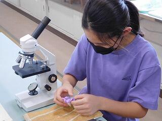 アサガオの花を手で裂いて、自分たちでおしべを取って、顕微鏡で観察をしました。
