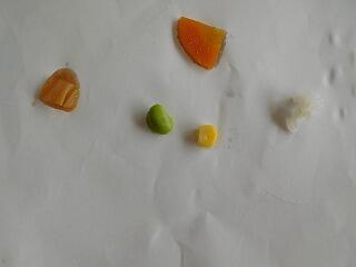 給食でも試してよいということで、ヨウ素液を借りました。今日の給食の食材を少しずつ取って試したところ、なんと、この中のすべて(ごはん、にんじん、コーン、枝豆、キャベツ)、反応しました。