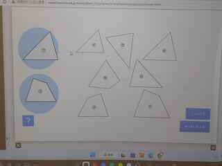 2時間目は、合同な2つの図形の対応する辺の長さと対応する角の大きさを調べました。