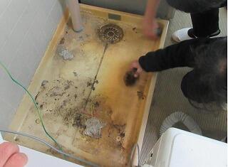 力を入れたのは、洗濯機の下があります。洗濯機をどかすことは普段ないので、埃がいっぱいに積もっていました。6年生はたわしを手に、バケツで水を流して少しずつきれいにしました。最後には、見違えてきれいになりました。