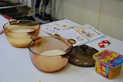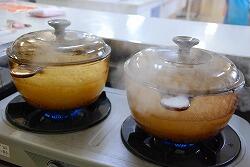 お米は,炊ける様子がよくわかるようにガラスの鍋を使って炊きました。