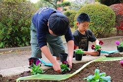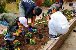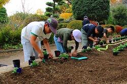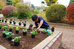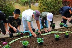 昼休みに環境委員会の児童が,登下校でみんなが通る場所にある花壇へパンジーの苗を植えました。
