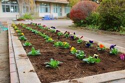 温かい日差しの中,花壇にはきれいなパンジーが並び,学校に彩りを添えています。