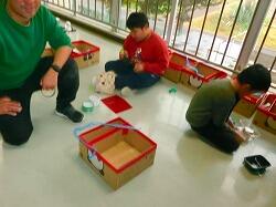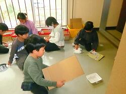 材料集めからスタート!牛乳パックや食品トレーなど,普段なら捨ててしまうものをリサイクルして使っています。