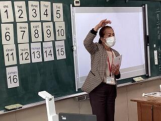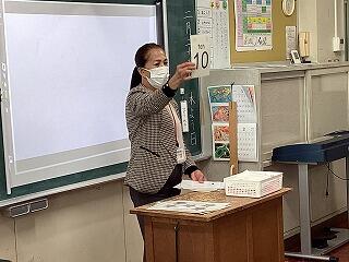 次に1から20までの数の言い方を教わりました。「Seven Steps」の歌も楽しく歌いました。エルサ先生のジェスチャーで楽しく覚えていきました。カードに描かれた絵の数も数えました。