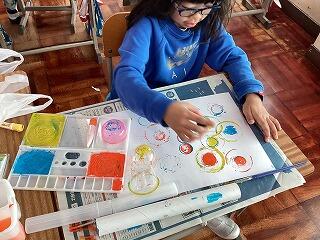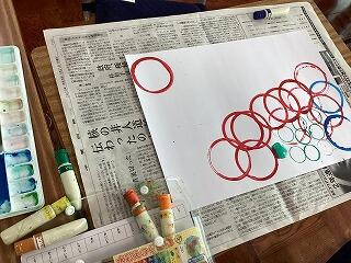 次に,ラップの芯やペットボトルのキャップなどを,準備した絵具に付けて形を映してみました。同じ形がいくつも映せたり,同じ材料でも絵具を付ける部分によって違った形が映せたりして,スタンプならではの楽しさを味わうことができました。