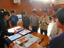 子どもたちは先生の近くに集まり,筆の持ち方や筆使い,気をつけるポイントを熱心に見学しました。