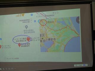 野田にあるしょうゆ工場の場所を、地図と丸を使って表しています。これも、修学旅行に行く前に行ったプレゼンでの経験などが生きています。原料も、写真と言葉で、見てすぐにわかるようなスライドにしていました。