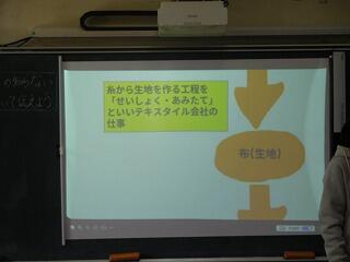 味のある手書きの図を使っていました。スライドでは短い言葉で見やすくまとめています。糸の種類などの難しい言葉もちゃんと伝えられました。