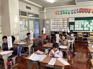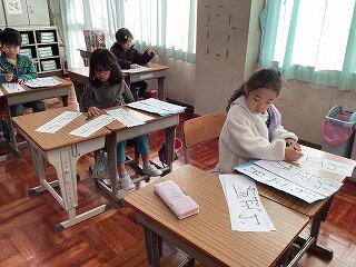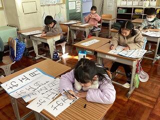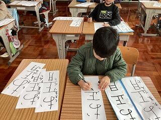 どの子も初めて書いた頃と比べると,大きくバランス良く書けるようになっていて,冬休み中,練習を頑張ったことを感じました。今年1年,今日のように1文字ずつ丁寧に練習し,良い文字を身に付けていけたらと思います。