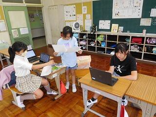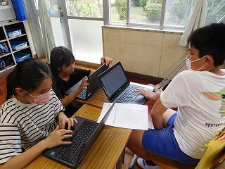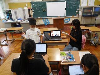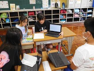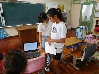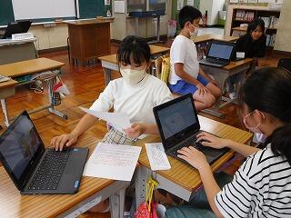 今回は、全員でプレゼンを見るのではなく、何人かで伝え合いました。スライドを見やすいように相手に向けたり、グラフを指さしたり、工夫していました。聞いている人は、ドキュメントでメモを取りました。