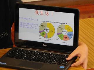 食生活・輸入グループと、食品の安全・安心グループに分かれて、日本の課題や取り組みについて調べてまとめました。相手のグループの友達に、自分が調べたことを伝えることになっていたので、どう伝えるかを考えたところ、全員スライドを使うことを選びました。