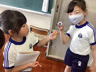 国語で、漢字の画と書き順を学習しました。ペットボトルのキャップに1年生の漢字と2年生で学習した漢字のシールが貼ってあるものを使って、画数じゃんけんをしました。