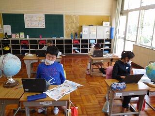 その後、地球儀にはどんなきまりがあるのかについての動画を見ながら、端末を使ってメモを取りました。タイピングの速度も、だんだん速くなっています。