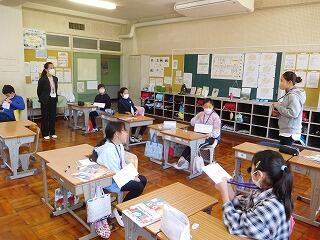 一人はアメリカ出身の先生です。クイズを交えながら、きつねやうさぎなどの動物がいることなどを話していました。