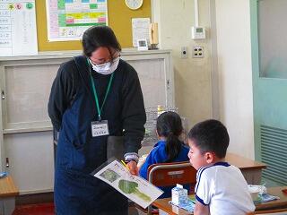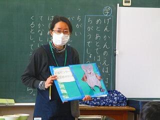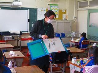 1年生の教室で,畑での野菜の様子や育ち方,栄養等について紙芝居を使って指導してくださいました。