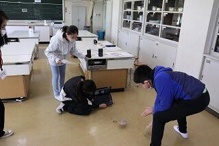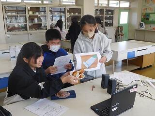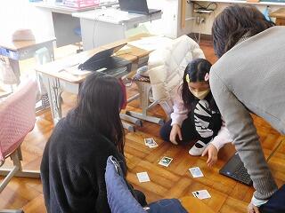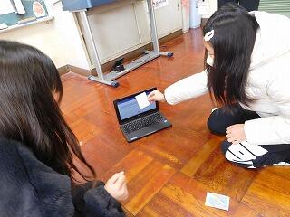 かるたを紹介したグループの人数は、2人でした。2人で札を取り合うところを見せたいので、札を読む役割の人をつくることができません。そこで、端末で事前に札を読む声を録音しておいて、本番は、その音声を流し、2人でかるたを取るところを演じていました。端末を活用したすごい工夫です。