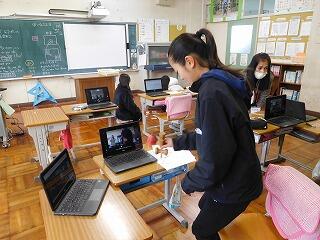すぐにオンラインを開始しました。5年生は3グループです。10分たったら次の端末の前に移動して、違うALTと交流するというやり方をしました。