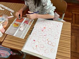 次に,ラップの芯やペットボトルのキャップなどを,準備した絵具に付けて形を映してみました。同じ形がいくつも映せたり,同じ材料でも絵具を付ける部分によって違った形が映せたりして,スタンプならではの楽しさを味わうことができました。