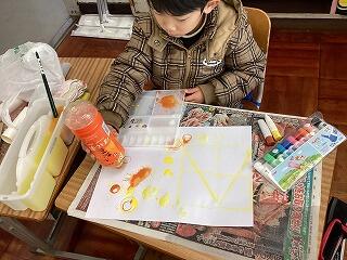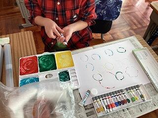 まずは,好きな絵具をパレットに出して準備をしました。絵具は少し濃い目に作るとくっきりとした形が映せます。