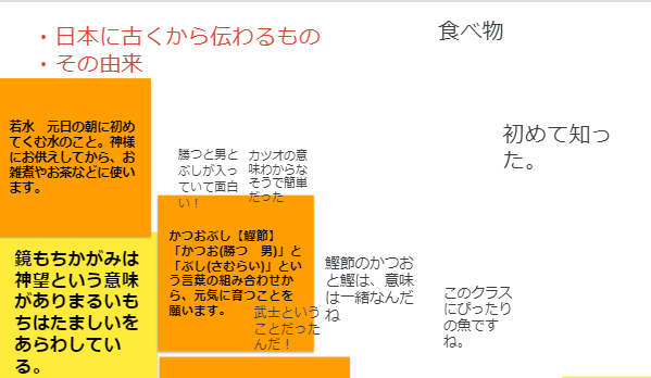 おせち料理の由来を教科書で読んでから、日本の伝統・文化について、本やSagasokka!という調べ学習応援サービスで調べ、ジャムボードに情報を書き込みました。