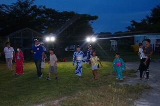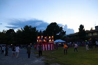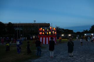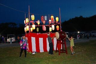 子供から大人まで一緒に踊って楽しんだ盆踊り。本校児童4年生も太鼓をたたきました。