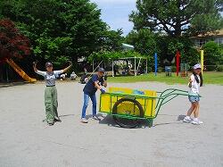 6年生は,草の入った袋をリヤカーや一輪車で集めました。