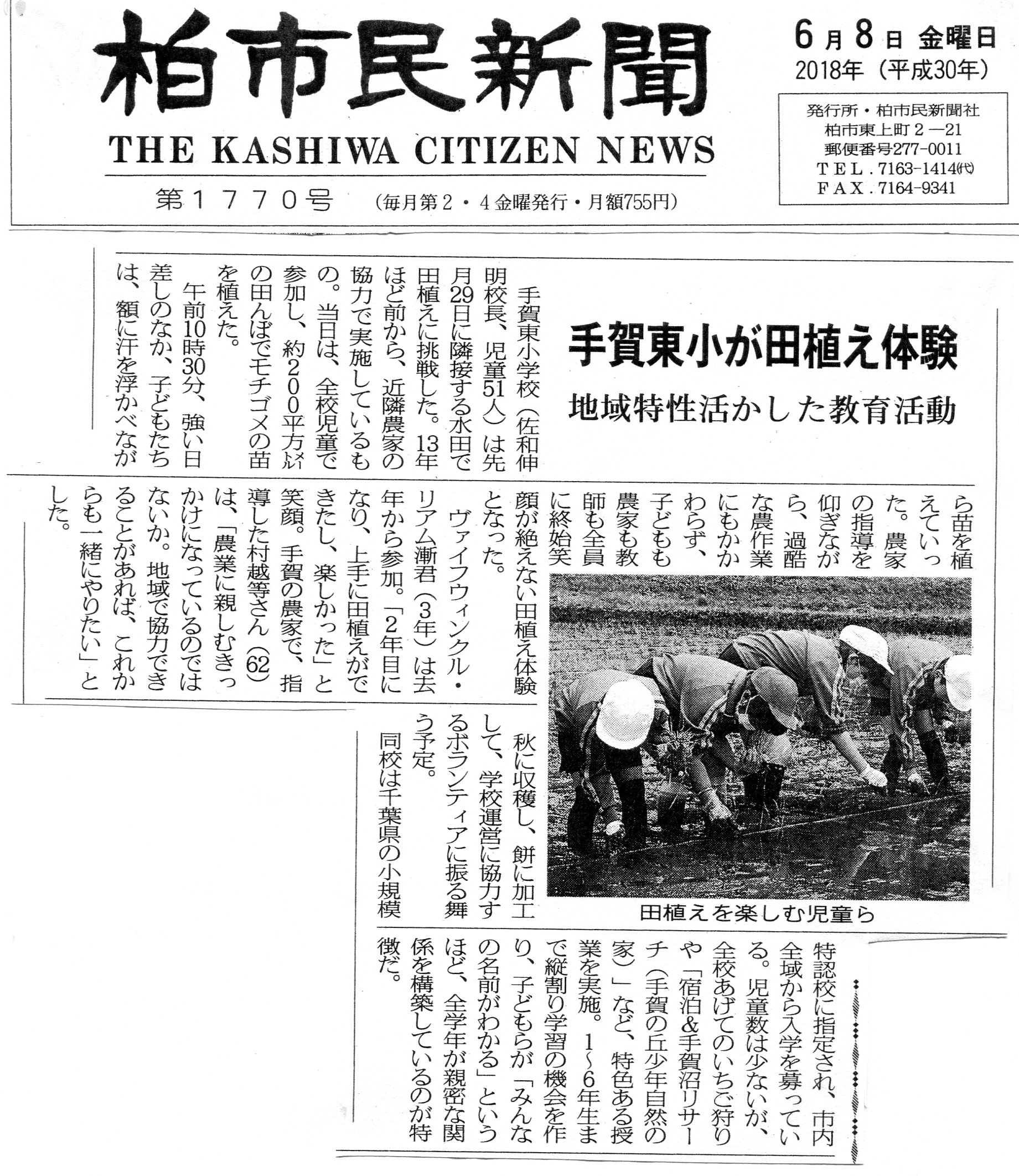 全校田植えの記事が掲載されました 投稿日時 : 2018/06/11 手賀東小学校管理者 大きくして読みたい方は、下記をクリックしてください。KASHIWA CITIZEN NEWS 180608.jpg {{options.likeCount}} {{options.likeCount}}