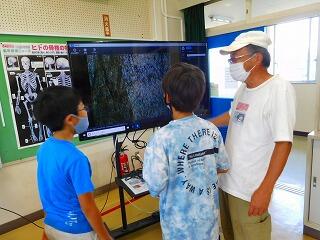 理科室の前では,顕微鏡で見えるものの様子をテレビ画面で見ることができます。