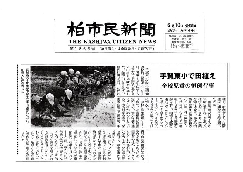 特色:田植えの記事が掲載されました 投稿日時 : 2022/06/18 手賀東小学校管理者 220610_kashiwashiminshinbun.pdf {{options.likeCount}} {{options.likeCount}}