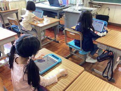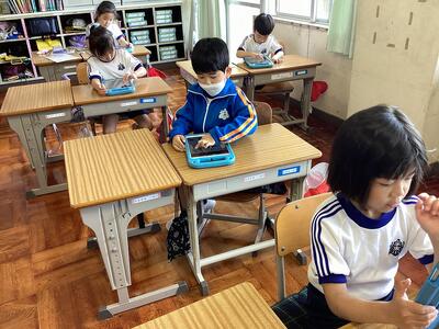 2時間目の算数「かぞえよう」では,カエルやキャンディの絵の数を数え,数字で書く学習をしました。数はわかっていても数字が鏡文字になってしまうこともあり,正しい数字で書けるように頑張っていました。その後はiPad「算数ボックス」の使い方を知り,形づくりの学習をしました。