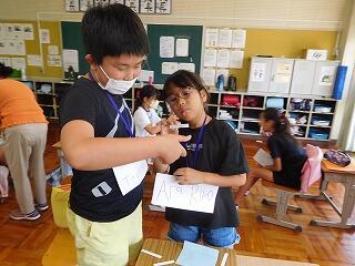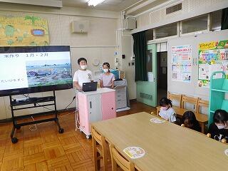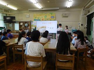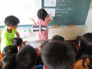 実は、6月にクラスで米づくりについて調べることを分担して、同じような内容を、5年生どうしで発表しました。そのままだと低学年に伝えるのは難しいので、難しい言葉を説明したり、難しい言葉を使わないで話したりと、工夫を入れました。