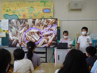 7月4日(火)、5年生は、全校に向けて、メディアルームで米づくりについてのプレゼンを行いました。↓