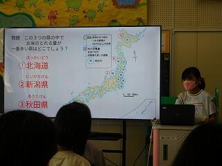 発表中は、みんな「えー!」と驚いたり、クイズで盛り上がったりしていました。農業に使う機械の値段や一年間で使う日数に驚いた人が多かったです。