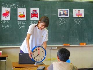 算数の「時かんと時こく」の学習です。まず,先生の1日の生活を見ながら模型の時計の時刻を合わせます。