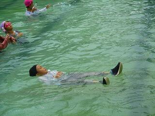 最後にペットボトルを使って浮く方法として,①ビート板法 ②ラッコ法 ③まくら法があることを教頭先生に教えてもらいました。みんなで体験しました。ラッコ法を試す人が多かったです。