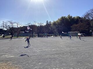 今朝はぐっと寒くなり冷たい風の吹く冬らしい日でした。でもそんな風さんとも仲良くなって,「ふゆとなかよしになろう」ということで,今日は凧あげを行いました。外に出ると,「いい風だ」「良く揚がりそう」というつぶやきが。そして早速凧あげ開始。風向きを考えながら,寒さを忘れるように凧あげを楽しみました。