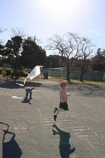 たくさん走って疲れると,「凧さん疲れたから,ちょっと休ませているの」とほっこりな言葉。凧が破れてもセロハンテープで貼って,糸が切れても結んでと,自分で修理をしながら遊びました。