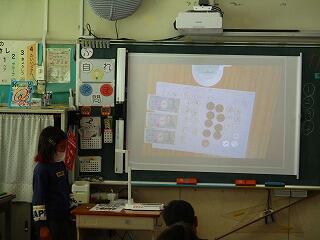 並べたお金をみんなと共有します。黒板に映して全員が自分の並べたお金と友達との意見を確認していきます。
