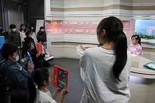 体験の最後は、ジャンケンで勝った代表児童が、先日の番組で実際に放送されたニュース原稿を実際に読む体験をさせていただきました。「50秒で読む」という条件がかなり難しいようで、プロのアナウンサーさんの技量の高さを学びました。カメラマンもプロの方が務めてくださいました。